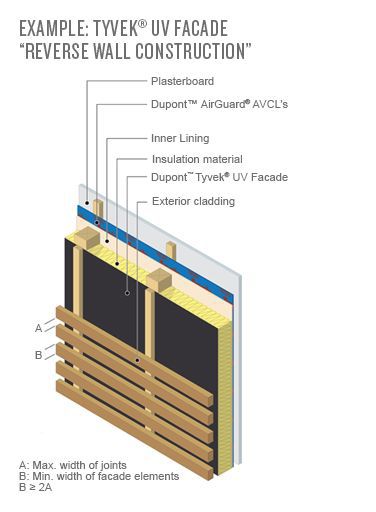 Los sistemas de protección para fachadas ventiladas Tyvek® UV Facade difieren de otras sistemas para paredes, aunque si bien la membrana sigue fijándose directamente a la estructura, se encuentra situada detrás del aislamiento. El material que debe especificarse depende del riesgo de condensación intersticial, que se determina por la temperatura.
