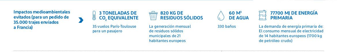 Para realizar la evaluación se consideraron tres escenarios distintos, que difieren en cuanto al número de prendas enviadas, la distancia de envío y el escenario de fin de vida (vertido, incineración o reciclaje, según la práctica de gestión de residuos del país de destino). Basándose en una cantidad de envío de 35.000 monos transportados por camión a Francia (escenario B), se predijeron los siguientes beneficios del Tyvek® 500 Xpert Eco Pack sobre el embalaje estándar: